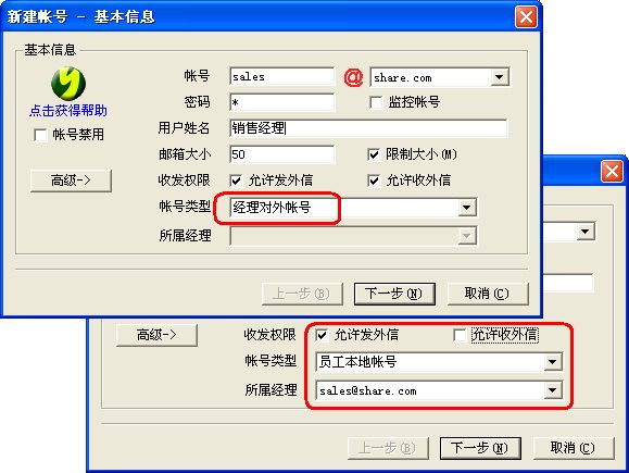 - DBMail共享服务器建立对外经理邮箱:帐号类型选择“经理对外帐号”.