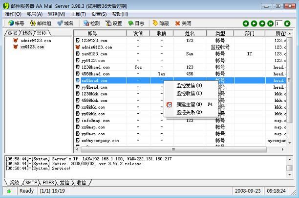 DB Mail Server允许设置任意多个监控帐号,每个监控帐号可以有三种监控范围:“指定”,仅监控所选定的部分帐号;“同域”,监控所有域名相同的其它帐号;“所有”,监控本服务器所有域名的所有帐号。同时DB Mail Server还提供监控选项,即可以选择监控某个帐号的发信还是收信。DB Mail Server针对于邮件监控做了特殊设计,如果1封邮件被多个主管同时监控,则这封监控邮件只会保存1份实体,因此您不用担心设置1000个主管同时监控某1个帐号会导致系统资源耗心的问题。