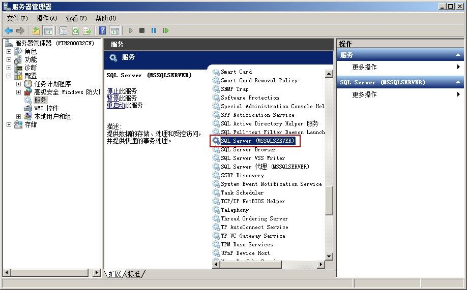 2) SQL Server服务名:在“服务”窗口中,双击“SQL Server(MSSQLSERVER)”(如图 1‑4)。